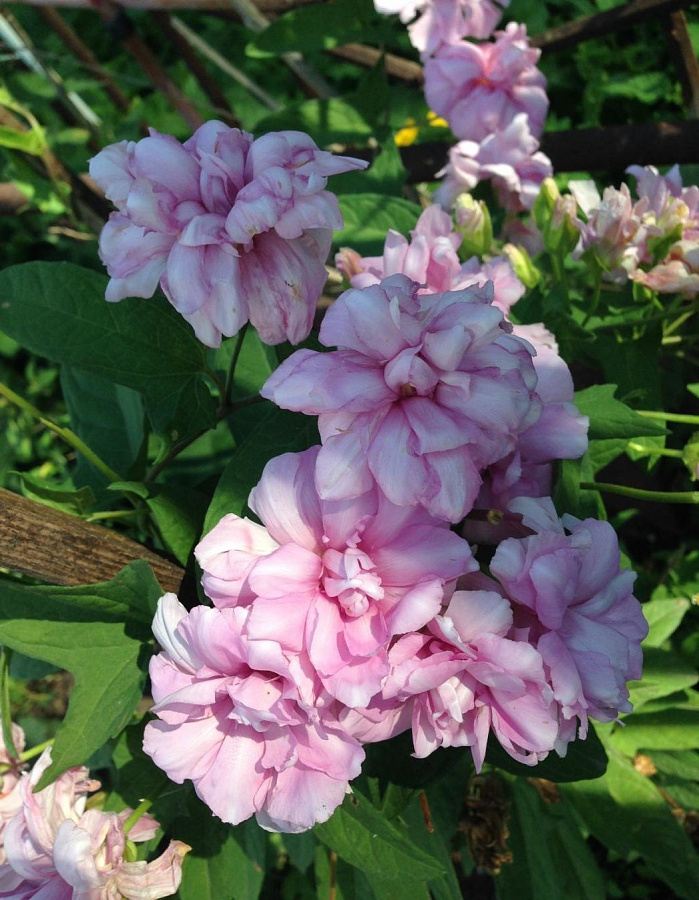 В длину стебли могут вырастать до 3-4 метров. Листья ланцетные, яркого зеленого колера. Цветки крупные, около 9-12 сантиметров в диаметре, махровые, пастельно-розового цвета. Обильное цветение начинается в июле и длится до сентября.