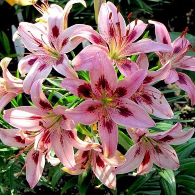 Луковицы Лилии азиатской Леди Элайн (Lilium asiatic Lady Elaine) в период цветения удивят своей привлекательностью и оригинальной расцветкой даже самых искушенных цветоводов. На высоком (до 80 см) цветоносе распускается несколько крупных (14-16 см в диаметре) нежно-розовых цветков с центром насыщенно-бордового цвета. Всю поверхность лепестков россыпью украшают такие же контрастные бордовые крапинки. Отличительной особенностью Леди Элайн является то, что зацветает она намного раньше других сортов лилий. В некоторых регионах начало цветения может приходиться на весенние месяцы.