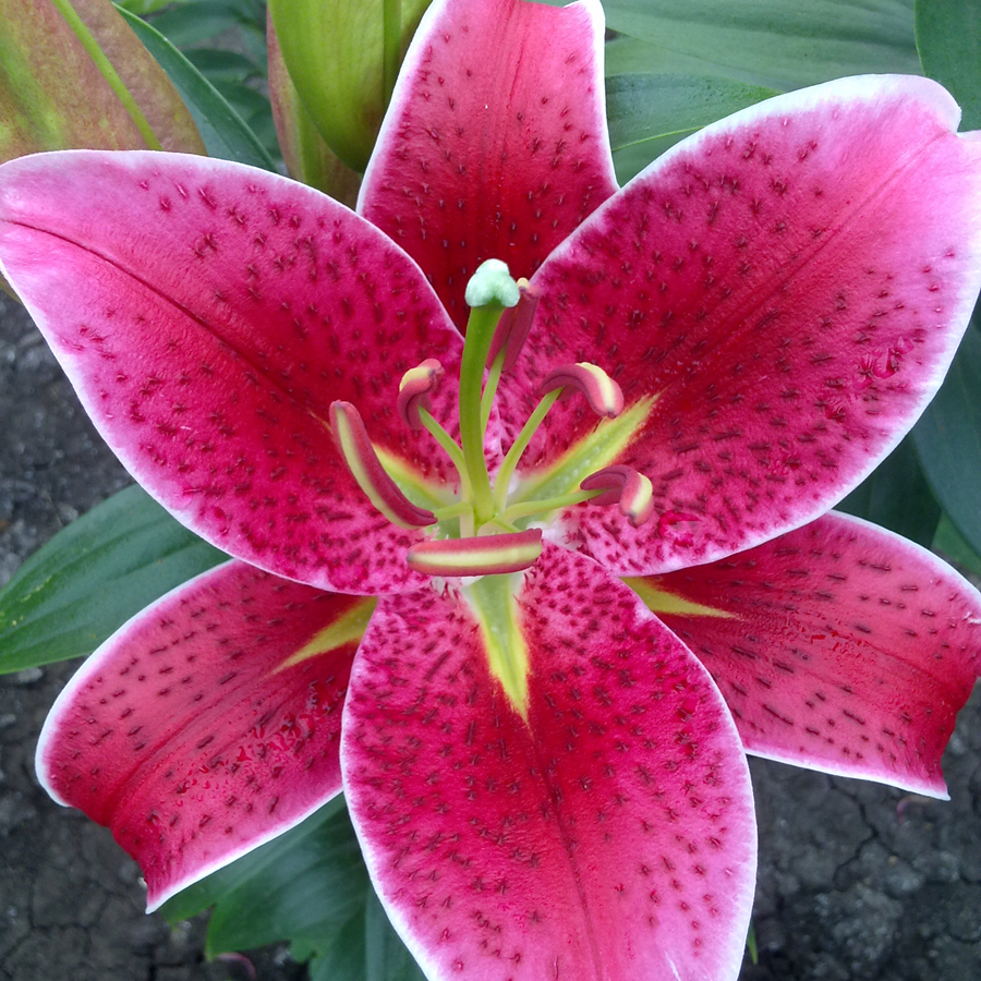 • Окраска цветка : малиново-красный ,с тёмным крапом, зелёное горло, край белый