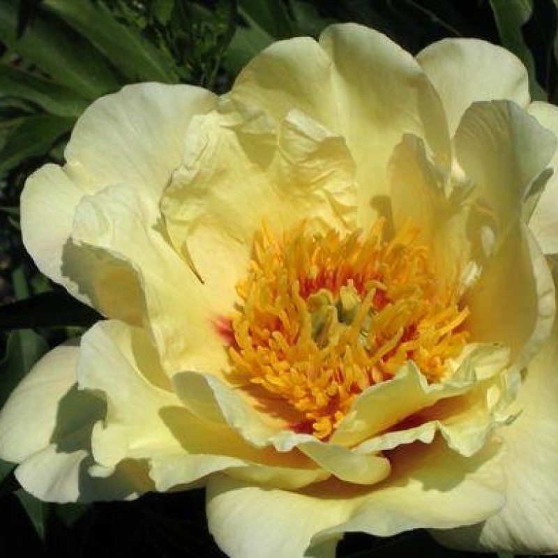 Саженцы пионов Вайкинг Фул Мун (Viking Full Moon) - это гибрид между травянистыми и древовидными пионами. Который обладает признаками и тех, и других. Высота растения до 80 см. Средне-крупные простые соцветия имеют нежно-желтую окраску с зеленоватым оттенком. Среднепозднего или позднего срока цветения. Цветок простой, большой, диаметром до 20 см, лимонный с красными пятнами у основания лепестков. Саженцы пионов Вайкинг Фул Мун предпочитают открытые и солнечные участки с окультуренными суглинистыми слабокислыми почвами